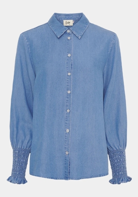 ISayn farkkuhenkinen paita on miellyttävän tuntuista lyocelliä. Siinä on paitakaulus ja nappilista edessä helmaan asti. Hihat ovat täyspitkät; hihansuissa smokkipoimutetut rannekkeet. Paita myötäilee kevyesti vartalon mallia. Koon M rinnanympärys 104 cm ja pituus takana niskasta helmaan 65 cm. Hihanpituus olalta hihansuuhun 61 cm.